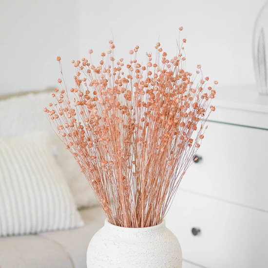 | Hamvas barack, festett len csokor. Rengeteg apró virágjával az egyik legkedveltebb szárazvirág. Illata nincs, nem hullik, formáját hosszú évekig megőrzi. | |