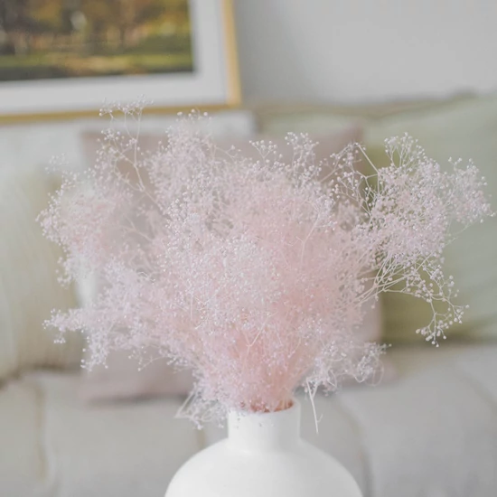 | A csokor 40 cm magas. Apró virágaival méltán nevezhető az egyik legmutatósabb szárazvirágnak. Ez a verzió preparált, a virágok tapintásra inkább "nedvesnek", mintsem száraznak érződnek. Nem hullik, ilata nincs. | |