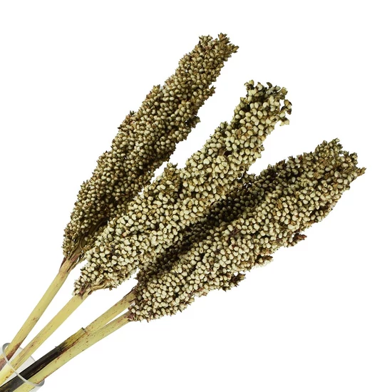 | Szárított cirok, 60 cm magas, natúr színben. Nehezebb virág, a csokor súlya kb. 250 g körül van. 1 csokor 4-5 fejet tartalmaz. | |