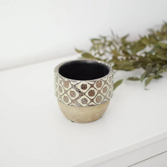 Egyedi kerámia kaspó geometrikus mintával – természetes tónusokkal és rusztikus karakterrel.