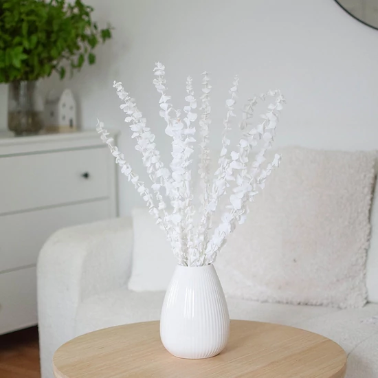 | Fehérített (hideg fehér), tartósított "baby blue" eukaliptusz. Nem szárítják, hanem preparációs eljárással tartósítják, ezért nem hullik, fogása puha, a friss levélhez hasonlítható. A leghosszabb ág 60 cm. | |