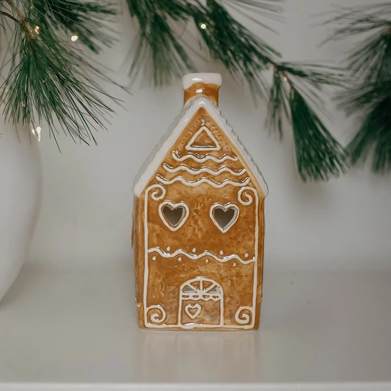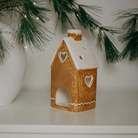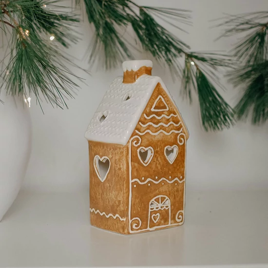 Nagyobb méretű kerámia mézeskalácsházikó mécsestartó dekoráció havas tetővel.