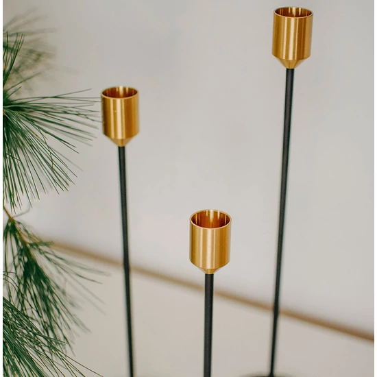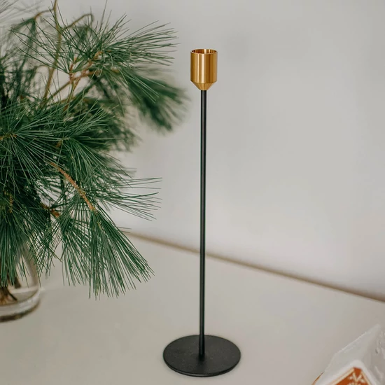 Elegáns fekete-arany fém gyertyatartó. A belevaló gyertya átmérőjee 22 mm.