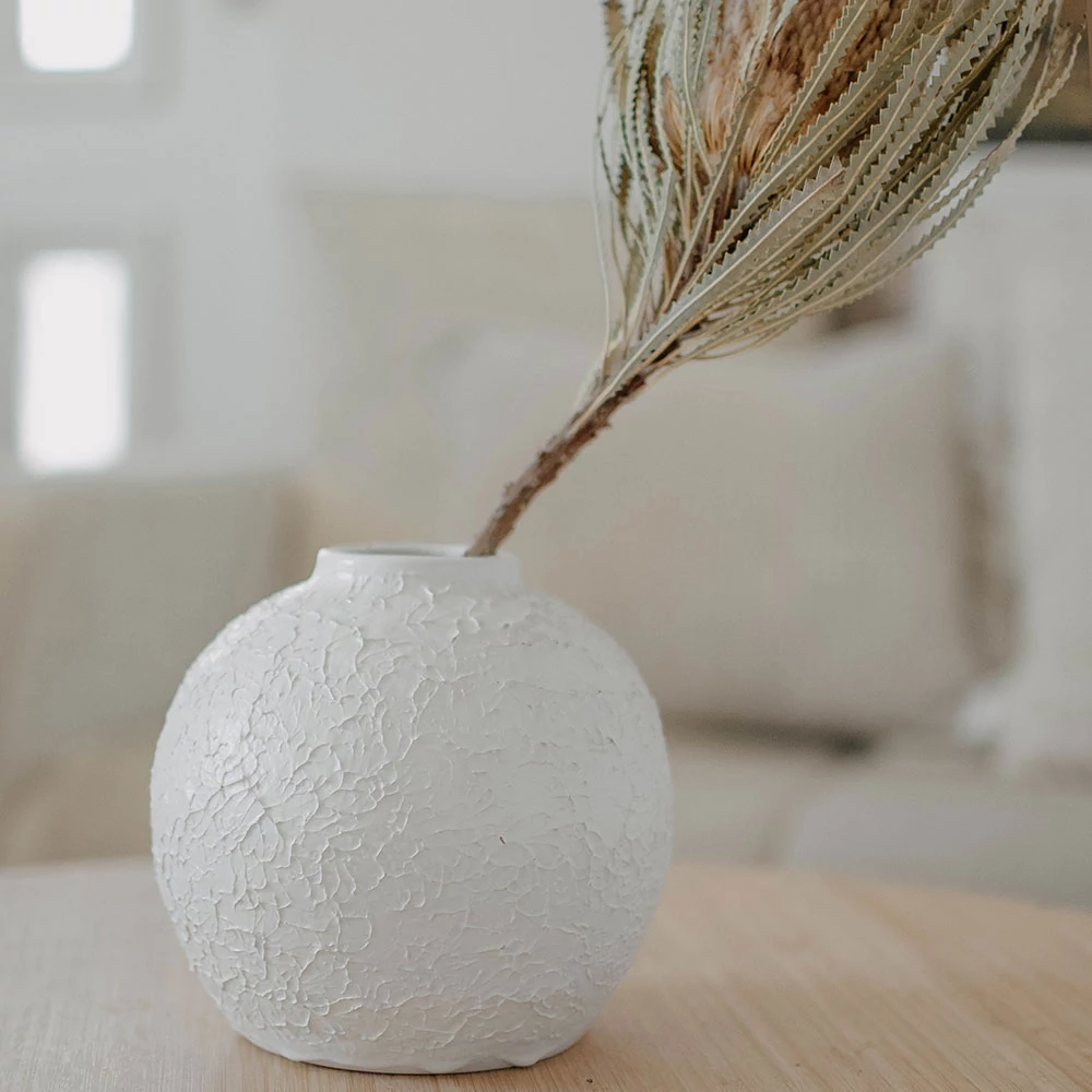 14 cm átmérőjű és ugyanilyen magas texturált felületű, fehér gömb váza. Hazai keramikusok terméke. A nyak átmérője 4 cm.